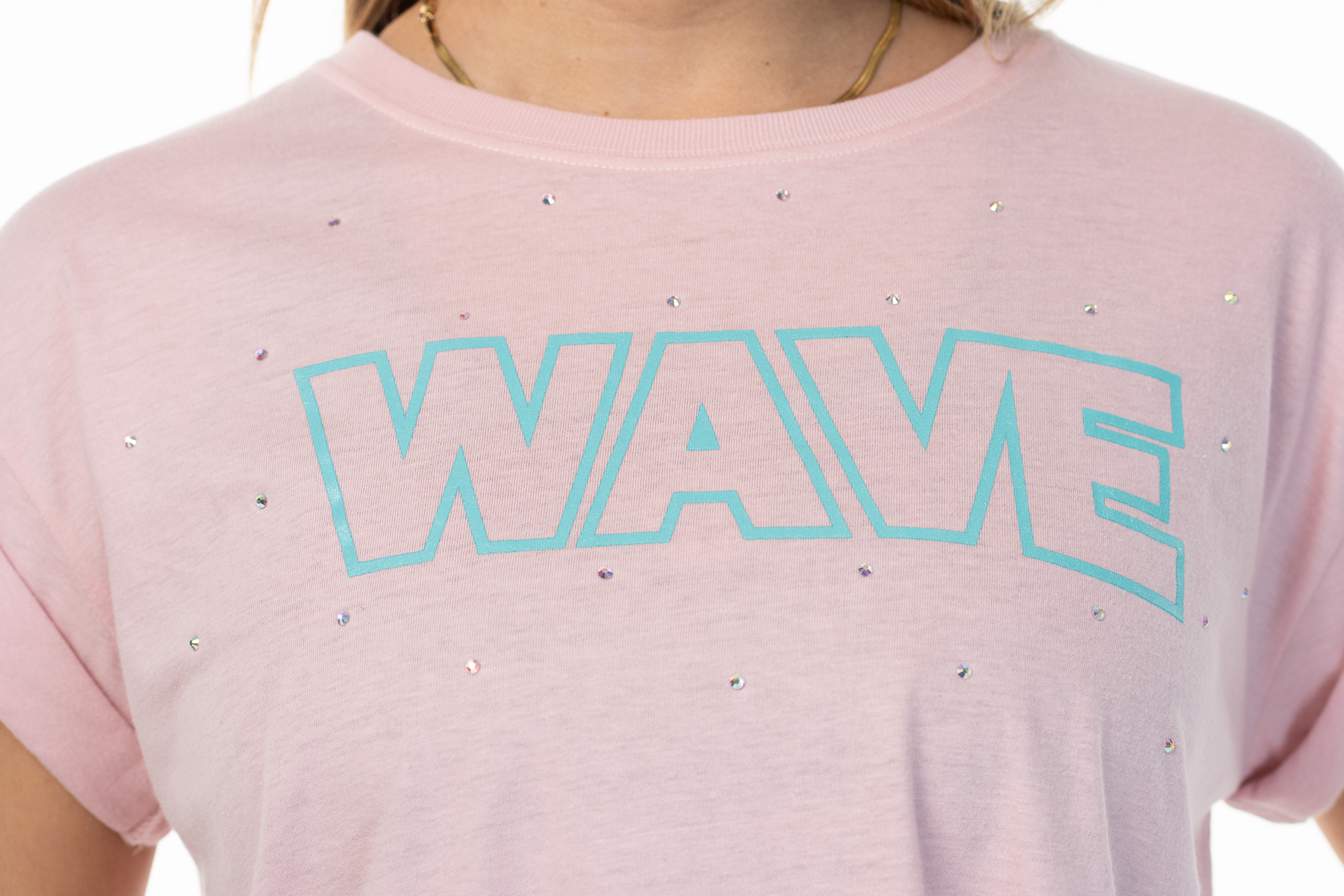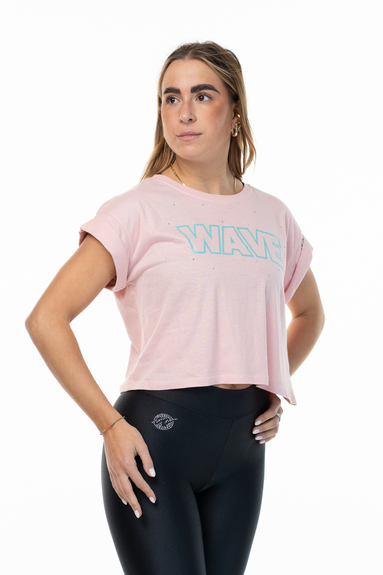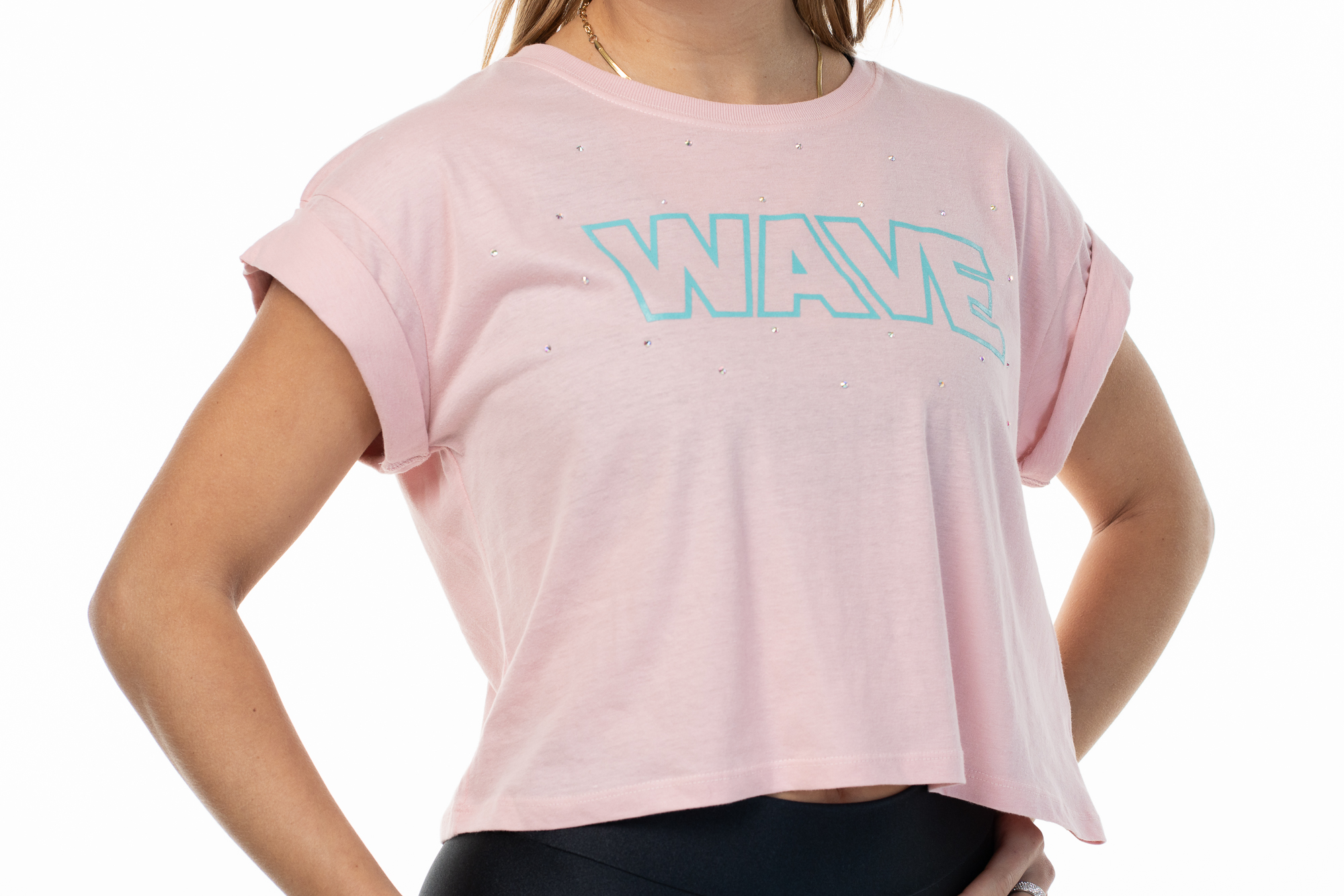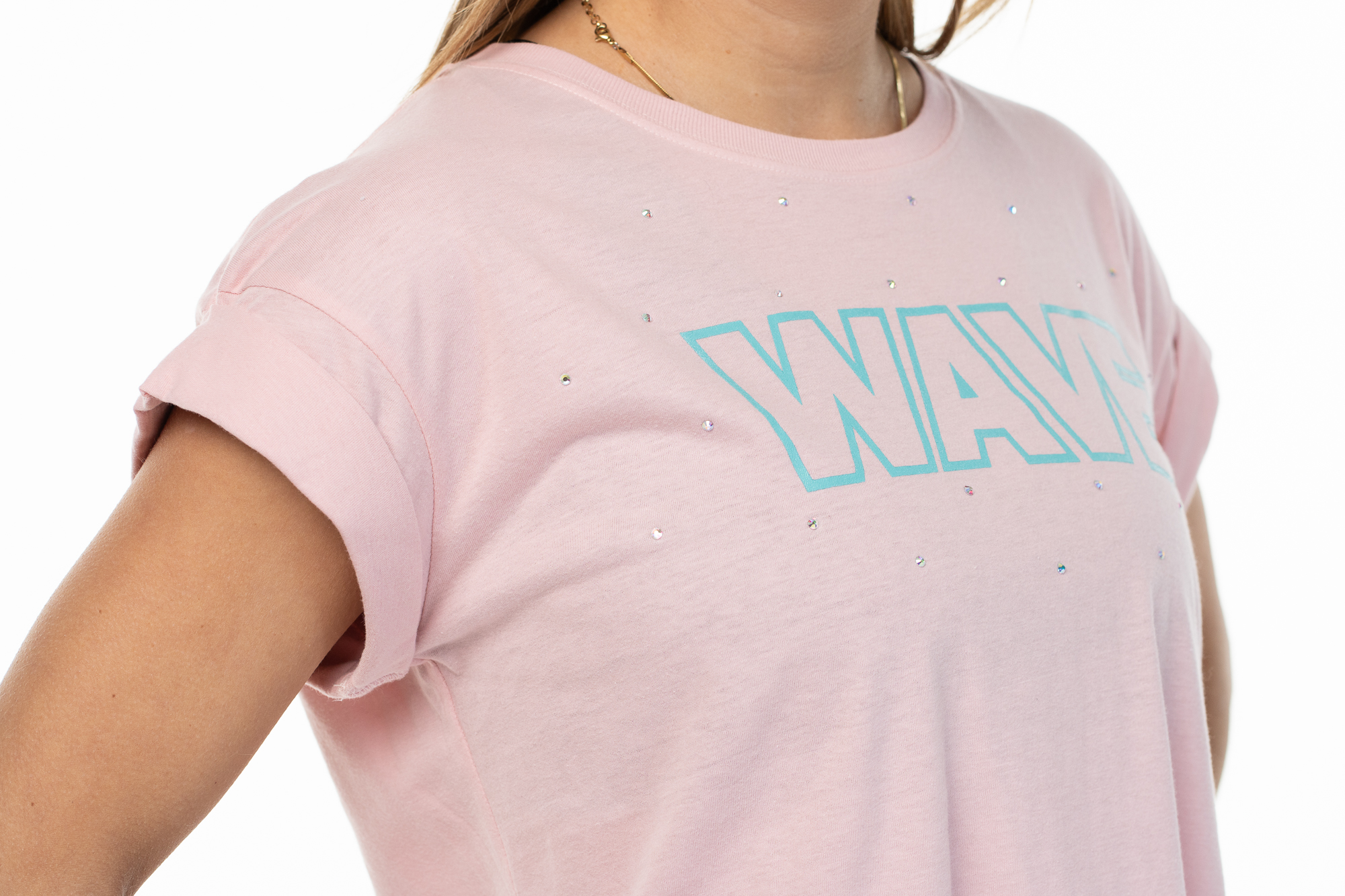 Aggiungi un tocco di scintillio e stile al tuo guardaroba con la T-shirt Wave. Realizzata in morbido cotone, questa maglietta crop è perfetta per chi ama combinare comfort e moda. Il design con maniche risvoltate conferisce un aspetto casual-chic, mentre i delicati strass Aurora Boreale aggiungono una nota glamour che cattura la luce in modo incantevole.